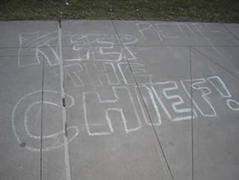 | “A Native student . . . said that she is tired of everyone thinking her identity is only in relation to the ‘Chief.’ She said that when someone meets her, the first thing they ask is not where she is from or about her schooling but instead her opinion on the ‘Chief’. . . . Anytime in one of her classes (from grade school on to the college level) Native Americans are discussed . . . she can see people turn and look at her to ‘see what the Indian says.’ “ Rene, who recognized this dynamic when reading Paul’s notes, added that it is a “similar situation to everyone looking at the African American in the class when talking about slavery or affirmative action.” Paul elaborated: “She said she does not even feel comfortable in the Native American class (it has close to 100 students, most of whom are white) since she is the only Native in the discussion section she was taking and they seem to do the same thing. . . . She said she came to the U of I to do nothing but get an education, but instead she was forced to get involved in being an activist because she could not deal with seeing the ‘Chief’ logo everywhere without trying to do something about it. She said that she does not feel safe at the U OF I and . . . that she is unable to ever just be a student because of the ‘Chief.’ She said that even though she is proud of her Native heritage she would like to have people look and relate to her as a person and not as the ‘Indian.’” (Chapter 1) |